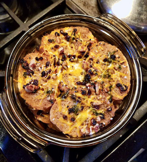 6. Cover the casserole tightly and bake for 30 to 45 minutes until it is bubbling and the bread puffs up and pushes against the lid.