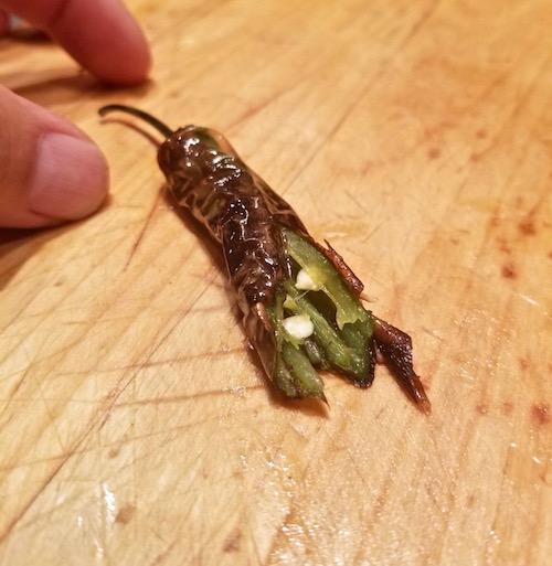 So, when making this delicious recipe, take a moment and think about the hundreds and thousands of years that people before you have domesticated and enjoyed chiles. I deseed the chiles so that the capsaicin, that’s the chemical that burns the skin, is significantly reduced and I can better taste the flavor of the chile.