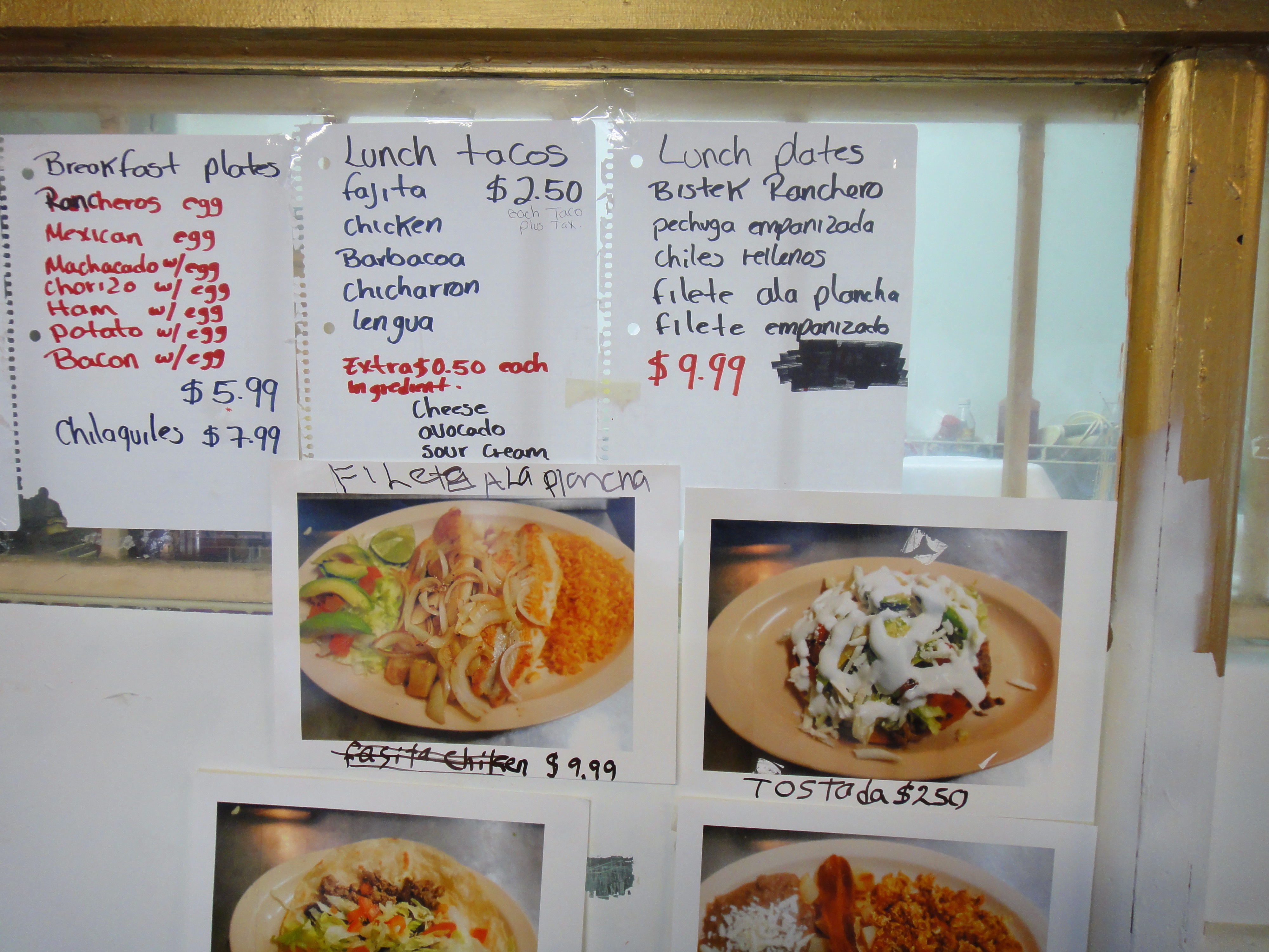 Both Texas and Veracruz Mexican dishes are popular. They’re listed all together on the menu, handwritten on spiral-bound notebook sheets that are torn off and taped to the wall. Breakfast plates include machacado (dried beef threads) with egg; chorizo and egg; ham and egg; and also chilaquiles, crisp corn chips that are bathed in green or red chile and served with an egg.