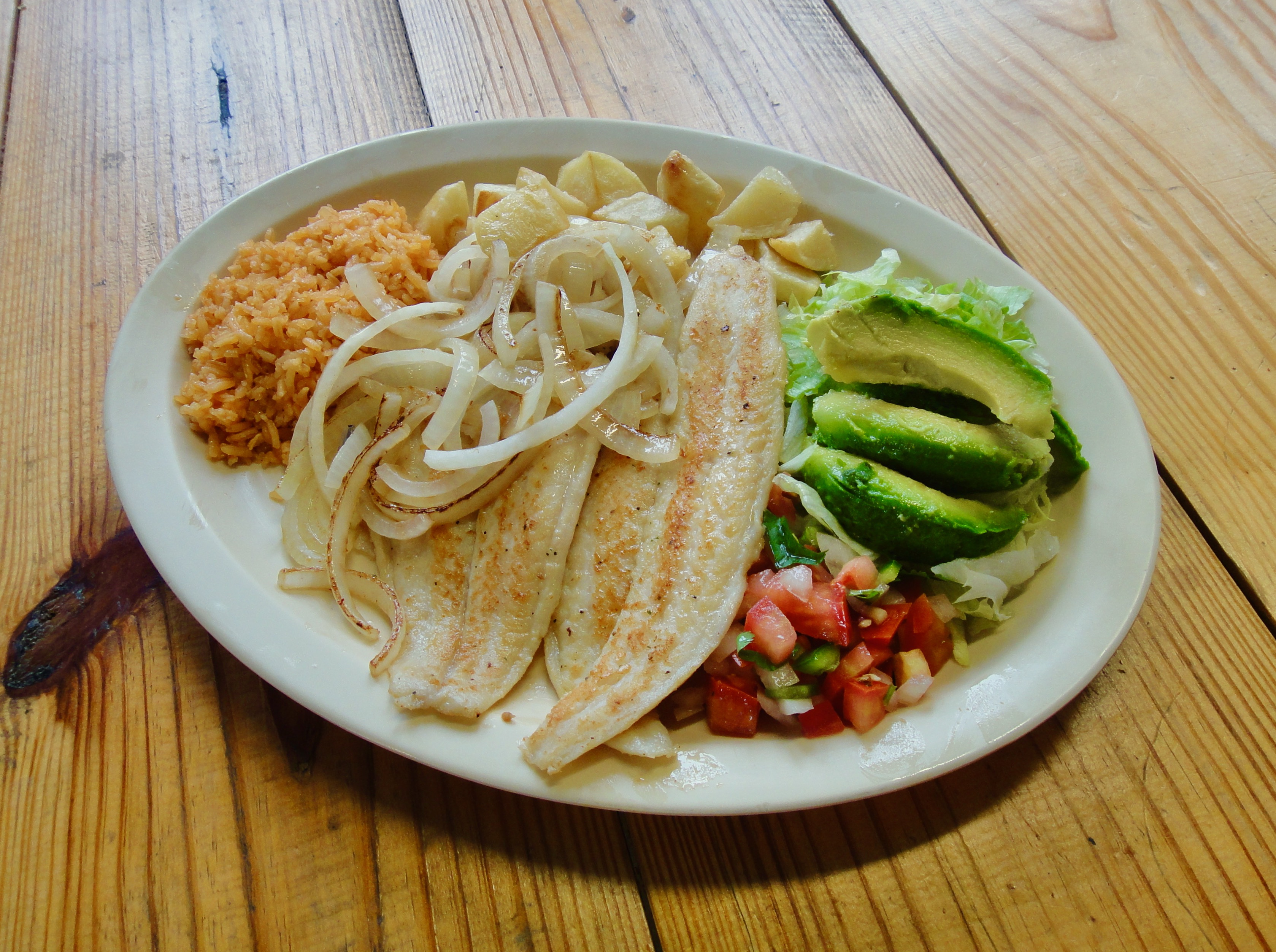The lunch tacos include barbacoa (yum!), fajita and lengua, tongue. The full lunch plates are squarely in the Texas Mexican traditions like chile relleno and steak ranchero, but there are also Veracruz Mexican traditions that, to my taste, are an interesting contrasted option. An example of the Veracruz coastal food is the lightly sautéed fish filet, “a la plancha,” overlaid with onions that have been cooked just enough to develop a little bit of caramelization for a touch of color and sweetness. Served with a salad, avocado, diced potatoes and lightly seasoned rice, it’s a perfect Veracruz lunch. It’s cooked “al momento,” à la minute.