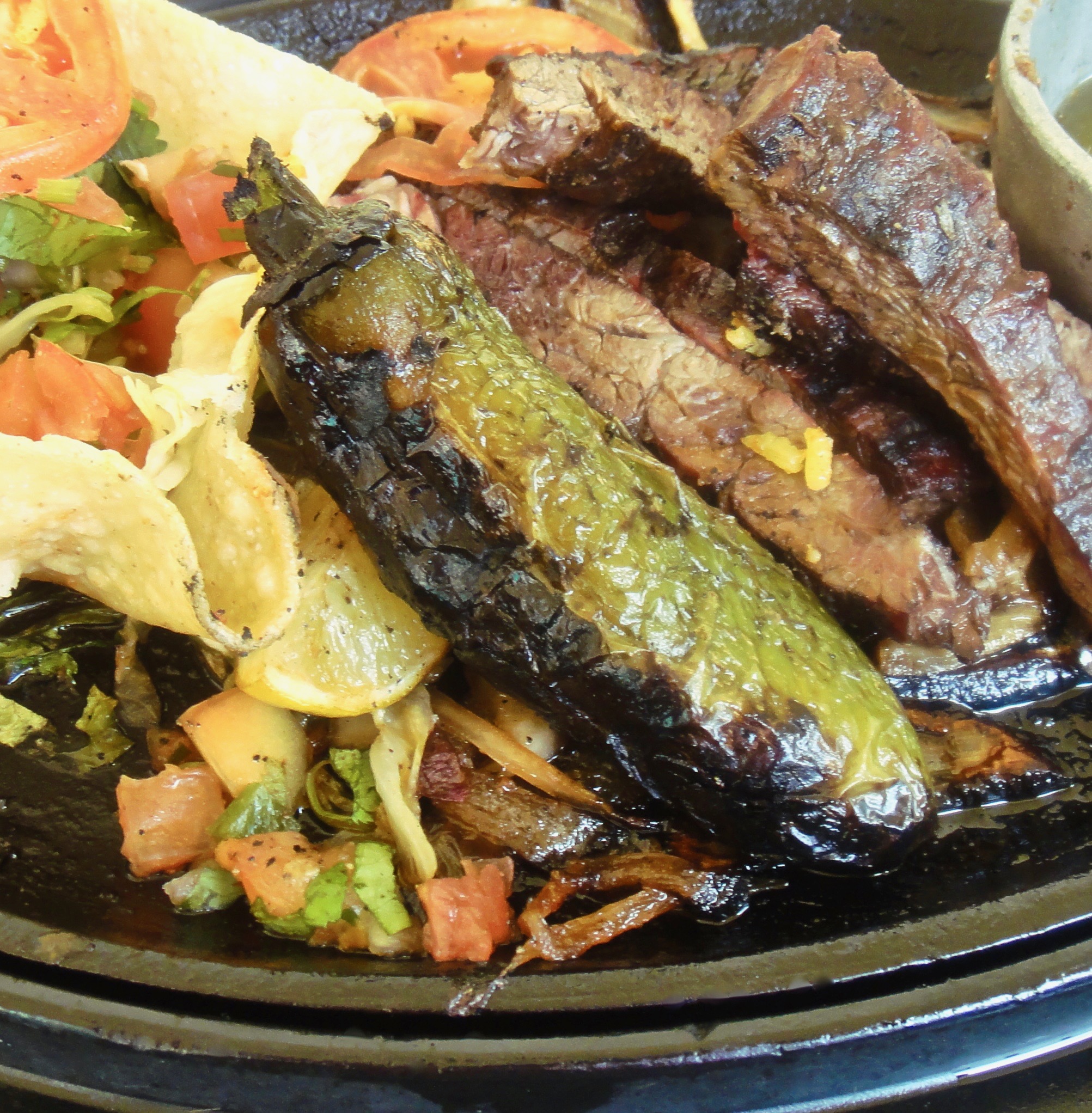 El Tiempo Cantina serves the chile toreado as a garnish, a whole jalapeño that’s been pan-fried, tossed around rapidly in the pan until the skin begins to blister black and brown. The Spanish word, toreado, refers to bullfighting, and to the bull that’s taunted in a bullfight. That bull is angry and ain’t gonna play around. Bite into that jalapeño that’s been turned and tossed around in hot oil and you’ll see the meaning of chile toreado. I love it. It’s served as the garnish on the fajita platter, but don’t make the mistake of thinking that it’s NFG.
