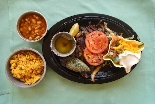 In culinary terms NFG means non-functional-garnish, an ingredient that’s just there for looks, a poser, and chefs hate NFG. Garnish should be part of the character of the dish, contribute to its taste, so of course it should be eaten. With the sizzling, hot-off-the-grill fajitas, it’s a natural accompaniment. I took a bite and, yum; it’s the thing to do. OK, I stayed away from the seeds which is where the burning chemical, capsaicin, is mainly stored. Charro beans, rice and a salad packed into a tortilla bowl are part of the platter, served with either flour or corn tortillas.