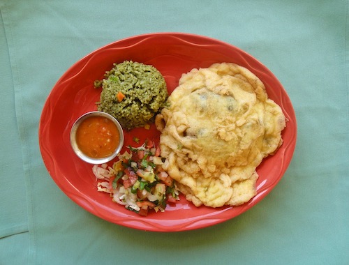“Chile Relleno A La Ninfa” is an egg-batter-fried stuffed Poblano chile. Completely in the comida casera, Texas Mexican tradition, the egg batter has just a tad of flour. This is the way it’s cooked in Mexican American homes of Texas and along northeastern Mexico. The filling is distinctive: pork carnitas, pecans, raisins, a hint of cinnamon and some cheese. The carnitas are small bits, with crispy edges. The combination of pork with raisins, pecans and cinnamon echoes an old Texas Mexican recipe, “turcos,” a type of empanada. As a stuffing for the Poblano it is unique and delicious. The relleno is served with a chunky, lightly flavored tomato sauce that you can either pour over the crispy batter or enjoy as a dipping sauce.