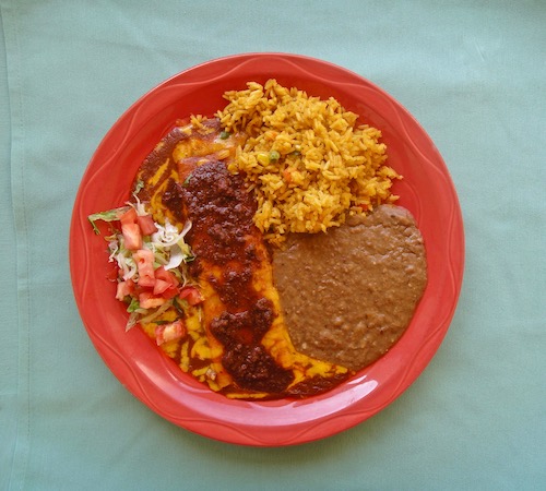 If there’s an iconic Texas Mexican dish among iconic dishes, it’s the cheese enchilada. Here, happily, it’s straightforward with cheddar and a beef chile gravy that’s flavorful and slightly piquant. I think it tastes like the enchiladas that have been served for generations in Mexican American families of Texas. Yellow cheese entered strongly into the “comida casera,” home-cooking of Mexican American families during the Depression when the government was giving out “relief cheese.” It was in many instances the only choice, and it was called, “queso relief.”