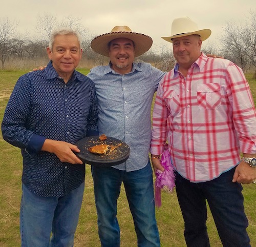 Mesquite country bread is made with mesquite powder (flour) and yeast (levadura) and the combination makes this an original unique pan de campo. I first tasted this recipe when I helped bake it with Francisco Guerra, San Antonio chef and caterer, at a celebration of the Native American community, Tap Pilam, at the Land Heritage Institute, a 1,200-acre site with archaeological evidence of continual human habitation over 10,000 years. Here I’m celebrating the last slice with Andrew Zimmern and Ramón Vasquez, Director of the American Indians in Texas at the Spanish Colonial Missions (AITSCM).