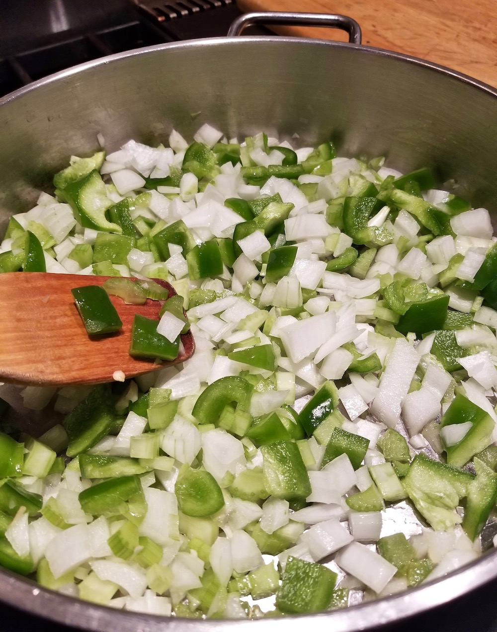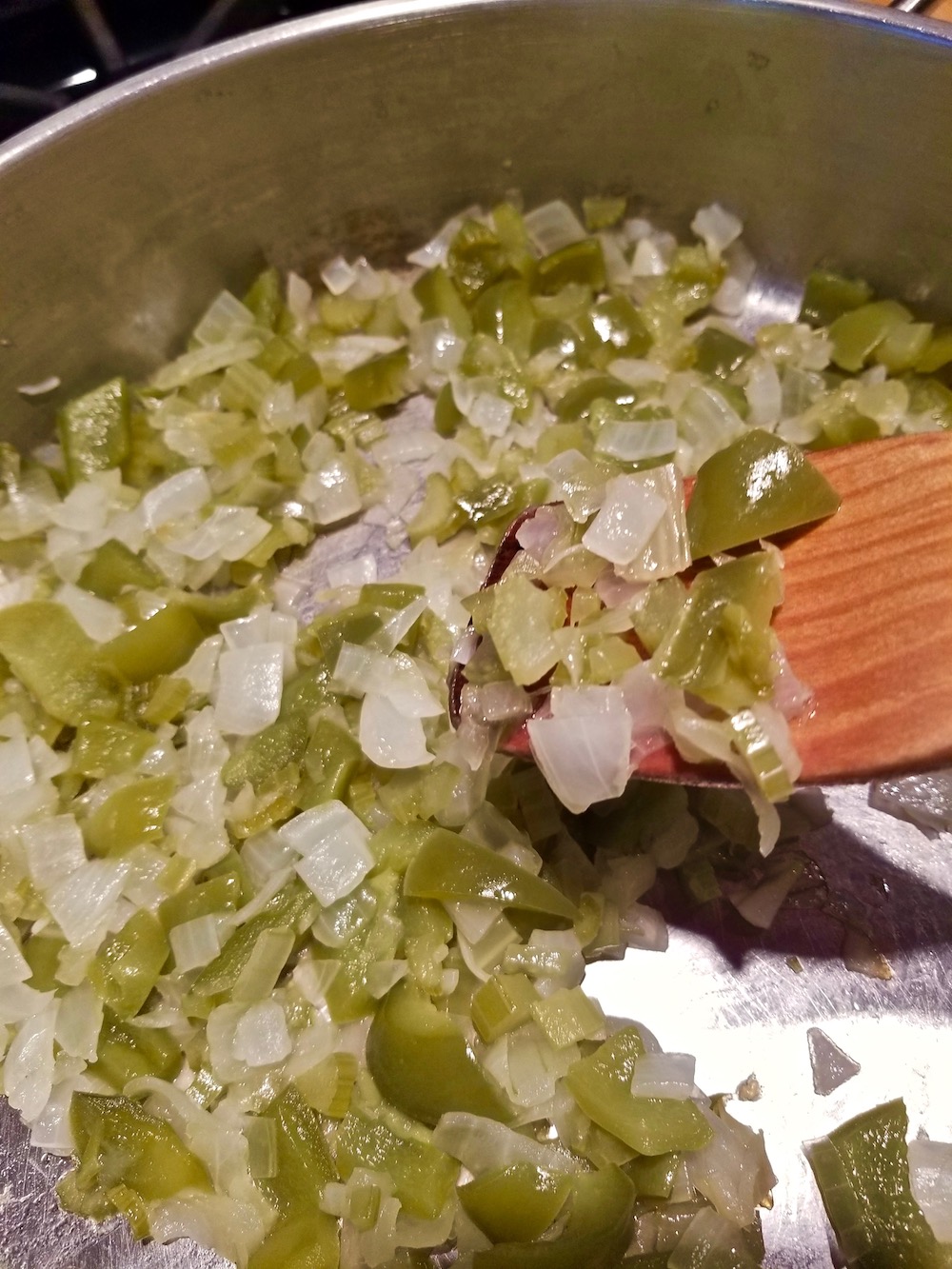 2. Heat 1 Tbs olive oil in a large skillet and add the diced bell pepper, celery and onion. Lower the heat to very low, cover tightly, and cook for about 15 minutes until the vegetables soften. The onion will be translucent and the green bell pepper will change color to an earthy green.