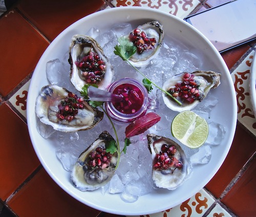 Adding an oyster bar was a decision that proved to be very popular. “You’d be surprised how many people like to shoot oysters,” he says. He displays a platter of six oysters on the half-shell sprinkled with pomegranate seeds and served with a dipping sauce of brilliantly red prickly pear with chile. It’s a riff on the “aguachile” that is traditional in the Mexican states of Sinaloa and Sonora on the Pacific coast.