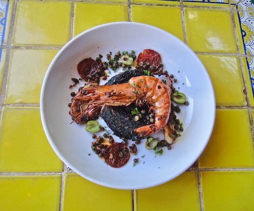 Chef Alex says he likes to play with flavors and to invite people to taste. In a way, he is expressing the global dimensions of contemporary Texas and our Mexican food. Before it disappears from the specials menu, hurry on over and order the grilled gulf prawn with black rice. It’s a fine-dining extravaganza. Atop a molded cone of black-colored rice is a giant prawn that’s smoke grilled (he prefers apple to mesquite for this). The rice is a delicate reference to Spanish paella. With butter he browns bell pepper, poblano, garlic and rice, and then adds olive oil, just a whiff of saffron, white wine and fish stock made in-house. Squid ink makes it black. It’s a world class Texas Mexican invention. Around the rice are thin slices of hard Spanish sausage, octopus and a chile guajillo paste for dipping.