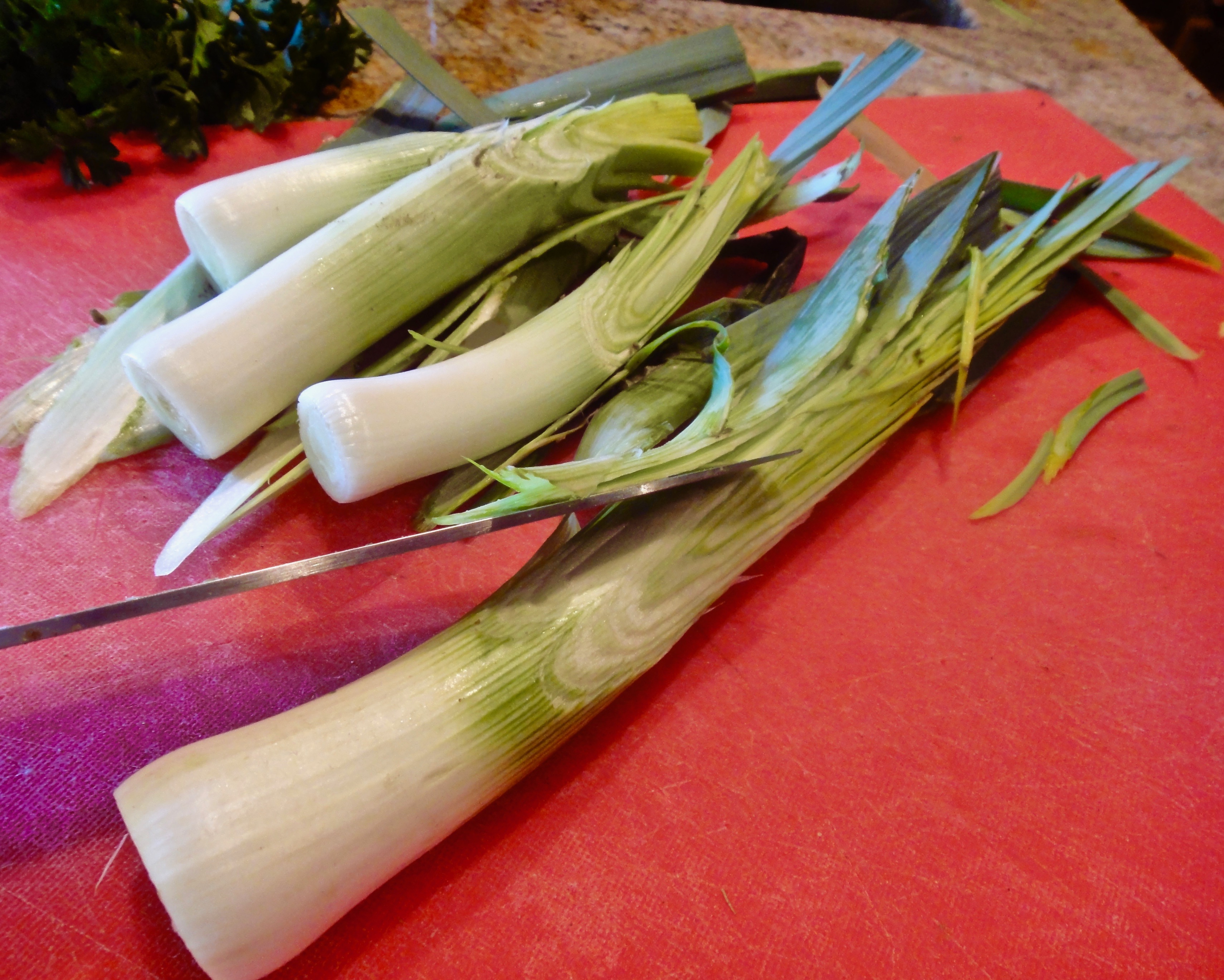 1. Trim the leeks with a sharp knife, slicing lengthwise in a sharp bias, to remove all of the outer tough green leaves. Slice down as far as needed, keeping intact the tender inner green leaves. Rinse the trimmed leeks thoroughly to remove grit.