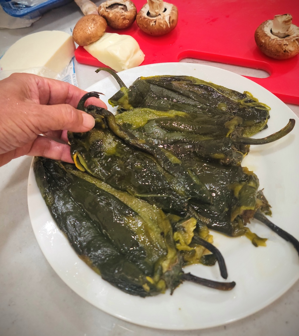 1. Place the chiles under a broiler. After about 5-7 minutes, when the chiles are roasted and a bit charred, turn them to roast the other side, also about 5 minutes, but watch them closely so they do not burn and turn black. The chiles will look slightly browned and blistered. Remove from the broiler and cover with a moist towel, allowing the chiles to rest for 15-20 minutes so that they will be easier to peel.